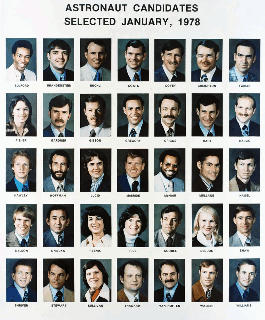 On June 18th 1983, history was made when astronaut Sally Ride went to space aboard the space shuttle Challenger. While almost exactly 20 years earlier Russian cosmonaut Valentina Tereshkova was the first woman in space, Sally Ride was the first American woman in space. Ride was part of a historic astronaut class, NASA Astronaut Group 8, or as they named themselves, the Thirty-Five New Guys (Figure 1). NASA Astronaut Group 8 marked a significant step forward in NASA’s diversity and the diversity of science on a global stage, as it was the first time women and people of color were part of an astronaut class.