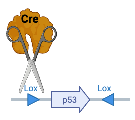 Figure 1. Cre action on Lox sites flanking the p53 gene results in the knockout of the p53 gene in cells expressing Cre. (Generated by author in BioRender)