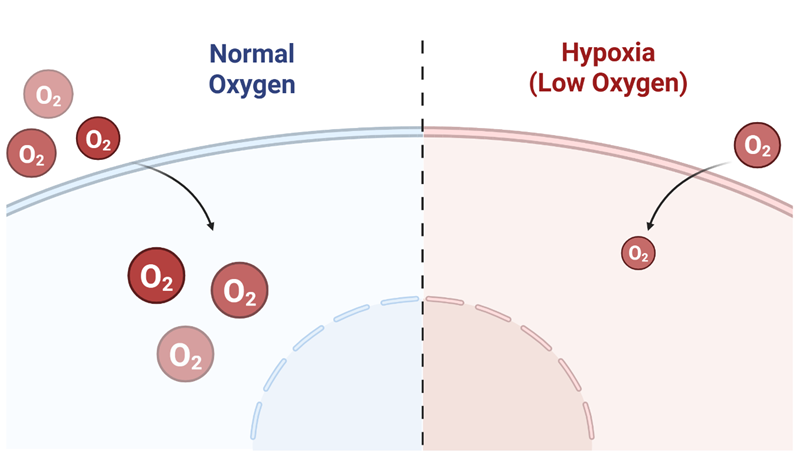 Figure 1: Under normal oxygen conditions, plenty of oxygen (O2) is available. In hypoxia, less oxygen is available creating a low oxygen condition. (Adapted by author from template in Biorender.)