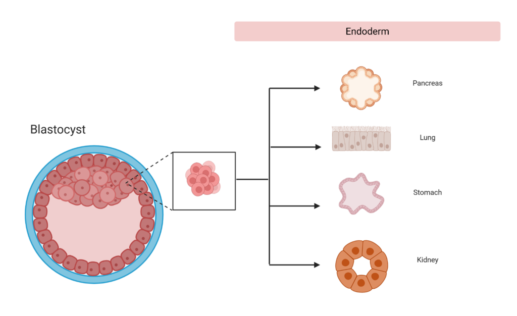 Endoderm Cells. Graphical depiction of human tissues/organs derived from endodermal cells – one of the 3 cell layers developing within a blastocyst, an early stage of embryo development. (Created by the author using BioRender)