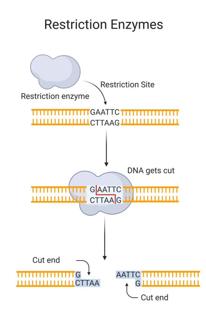 Figure 1: Restriction enzymes find their unique restriction site in the DNA. Then they cut the DNA and create two freshly cut ends. So basically, they are very specific DNA scissors! (Image is the author’s own work; created in BioRender.com.)