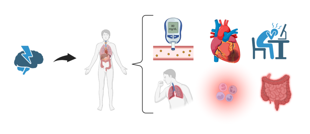 Figure 1. Stress can contribute to the development and severity of many diseases, including diabetes, cardiovascular disease, depression, chronic obstructive pulmonary disease, immune disorders, inflammatory bowel disease, and more. Created in BioRender. Milla, H. (2026) https://BioRender.com/iif6tjj