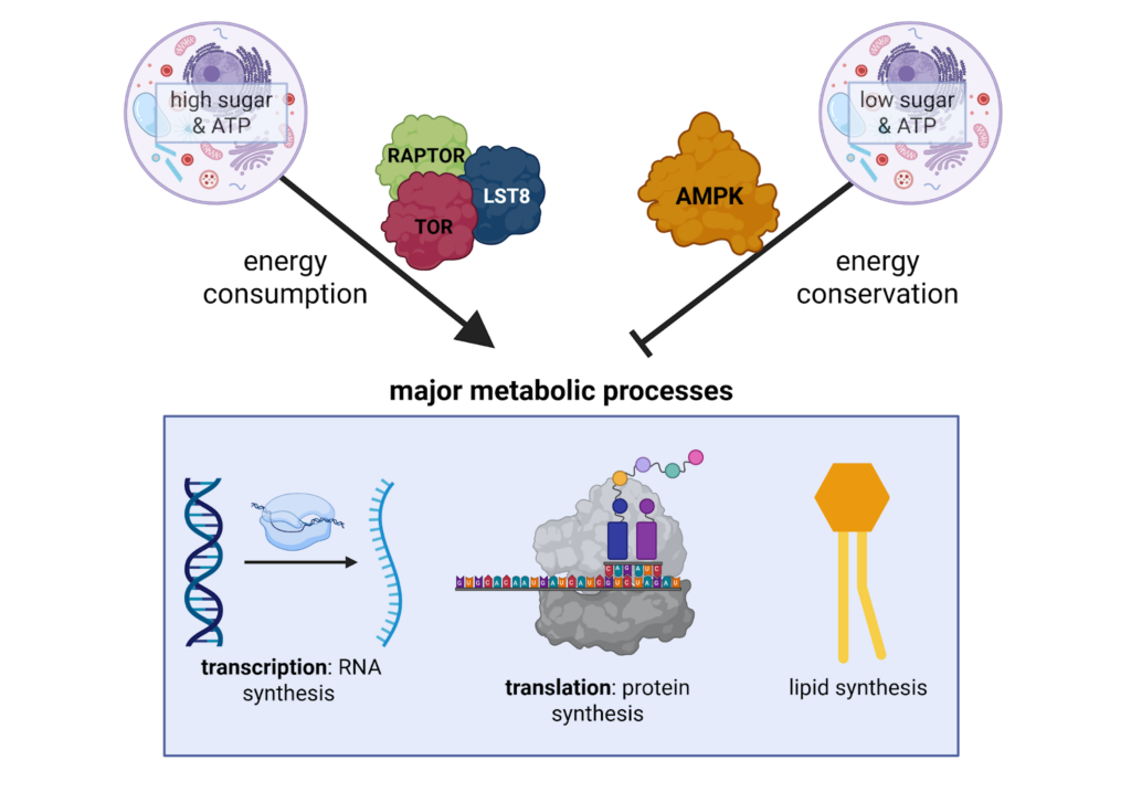 Figure 1 High ATP and glucose (sugar) levels activate TORC1 and promote anabolic processes like protein synthesis, nucleic acid synthesis, and lipid synthesis, while low ATP and glucose levels promote AMPK to inhibit anabolic processes. Figure created in Biorender.com