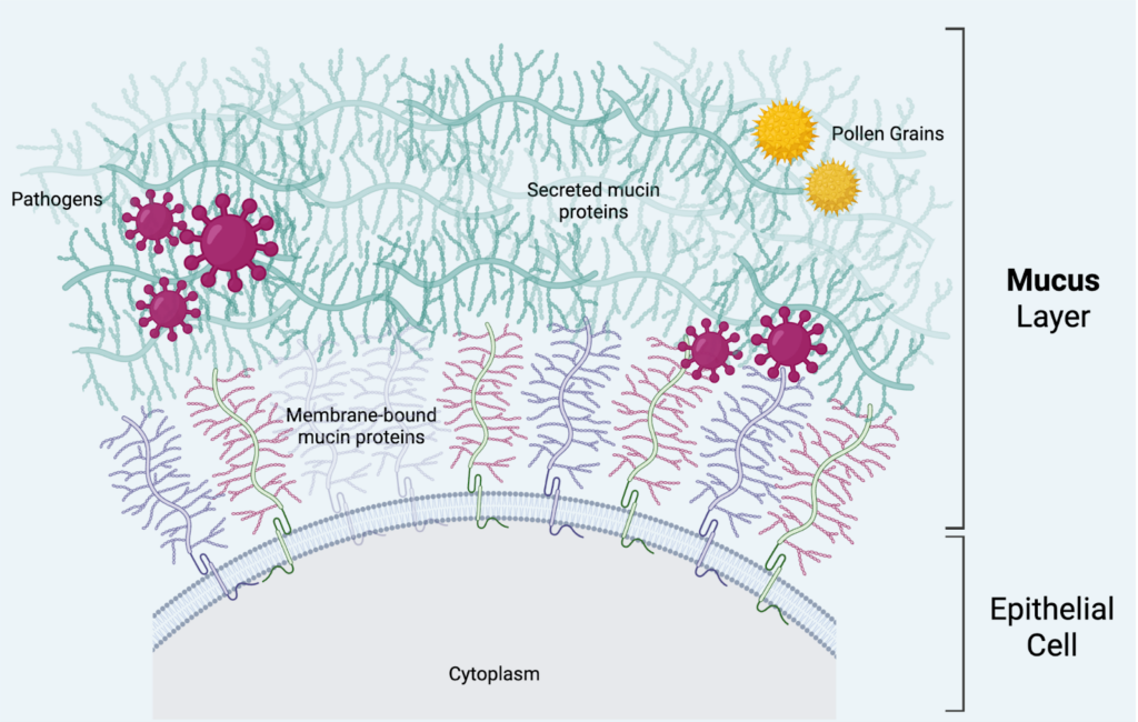 Mucus is a gel-like network that serves as a protective and lubricating barrier for the mucosal surfaces in our body. This viscous network is composed primarily of water and entangled mucin proteins, both secreted and bound to the outer surface of epithelial cells. The matrix traps pathogens, environmental allergens, native microbes, and shed epithelial cells, facilitating their removal and maintaining a healthy environment.