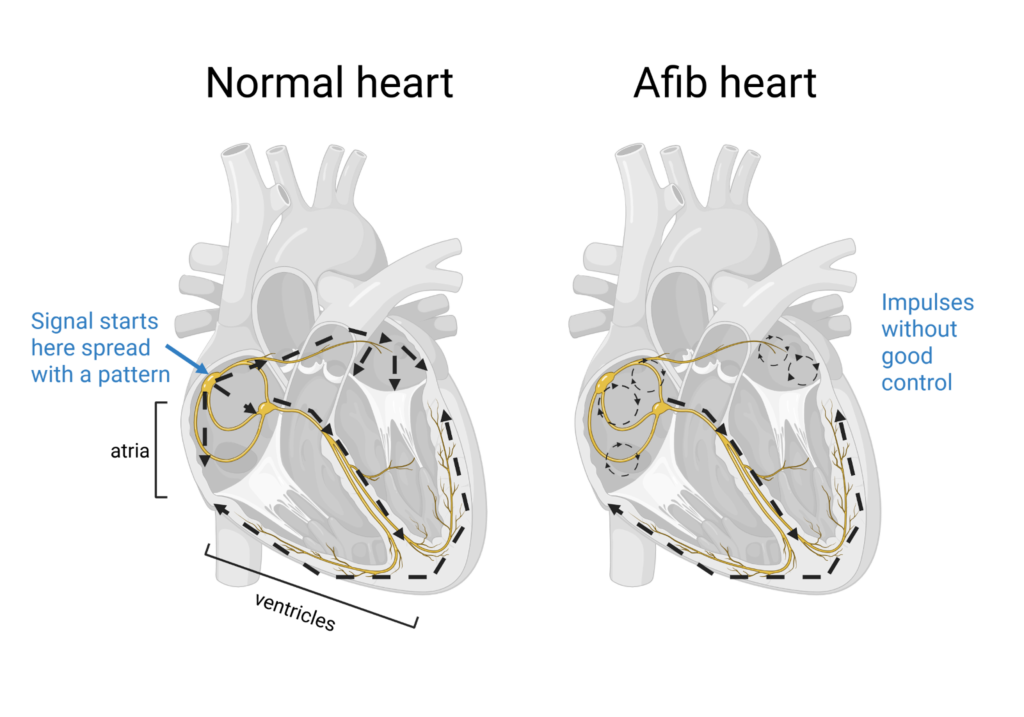 Figure 2. Cardiac conduction system in a normal heart and a heart with Afib. Normal impulses follow from the atrium to the ventricle. In Afib, the impulses in the atria are irregular and may circle within the atria. Image created by BioRender.