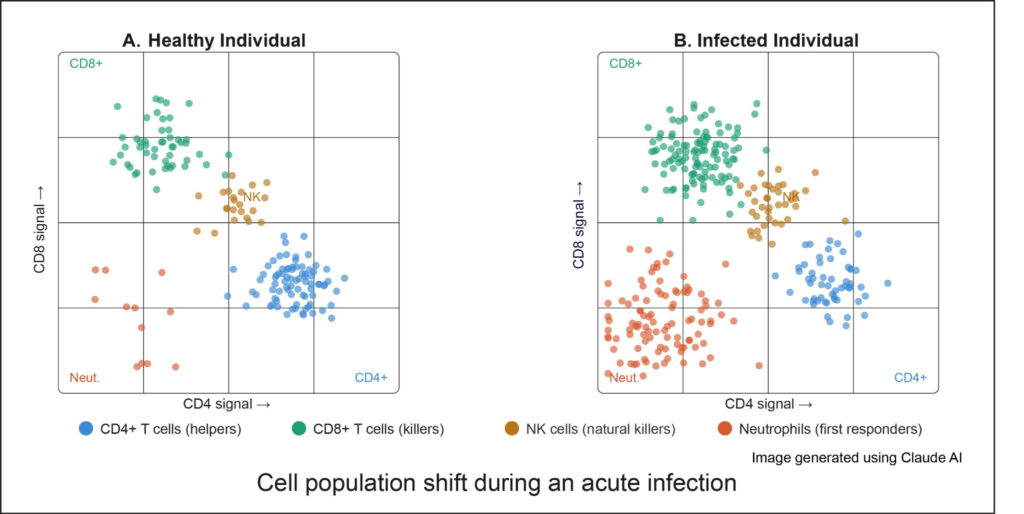 Now look at panel B (day 3 of infection). The clusters are still in the same positions — same cell types, same bins — but the number of dots has changed. The green CD8+ cluster is noticeably larger, and the red neutrophil dots have exploded in numbers. More dots in a cluster mean more of that cell type in the blood. That shift in numbers is the signal. It tells a researcher — or a doctor — that the immune system has mobilized, calling up more killer T cells and neutrophils to deal with the threat.