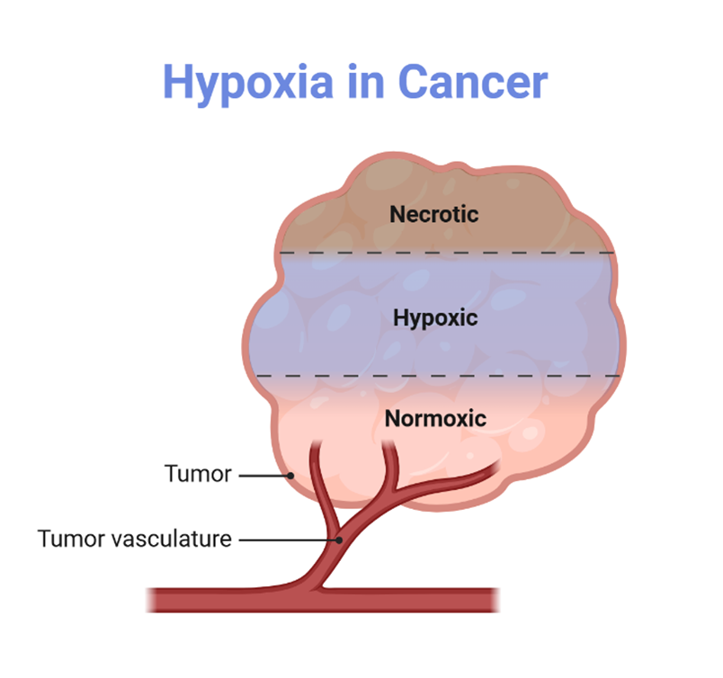 Figure 1: Cancer tumors are large masses of cells with an incomplete blood vessel system, making it very difficult for oxygen to reach every cell in the tumor. Some parts of the tumor have oxygen, which is called a normoxic state, while most of the tumor is in a hypoxic, oxygen-deprived state. The necrotic core is the portion furthest from the blood vessels, which experiences extreme oxygen deprivation. (Figure created by the author using Biorender.)